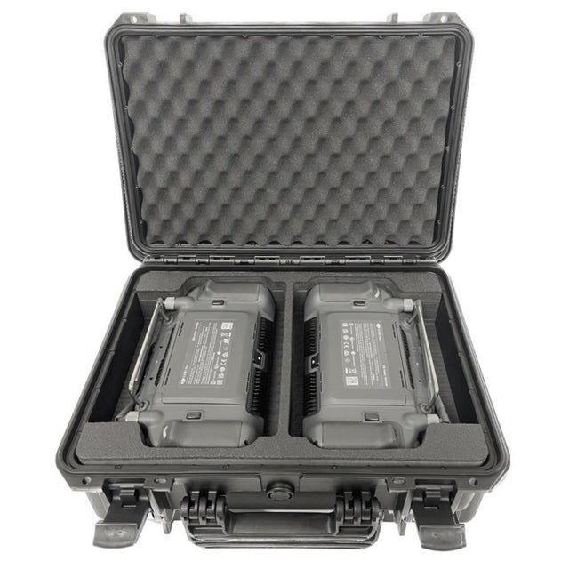 Hochwertiger, schlagfester und absolut wasserdichter Drohnenkoffer für maximalen Schutz bei Aufbewahrung und Transport ausgelegt für 2 DJI RC Plus Controller. Die Fernsteuerungen werden mit montierten Sticks verstaut.