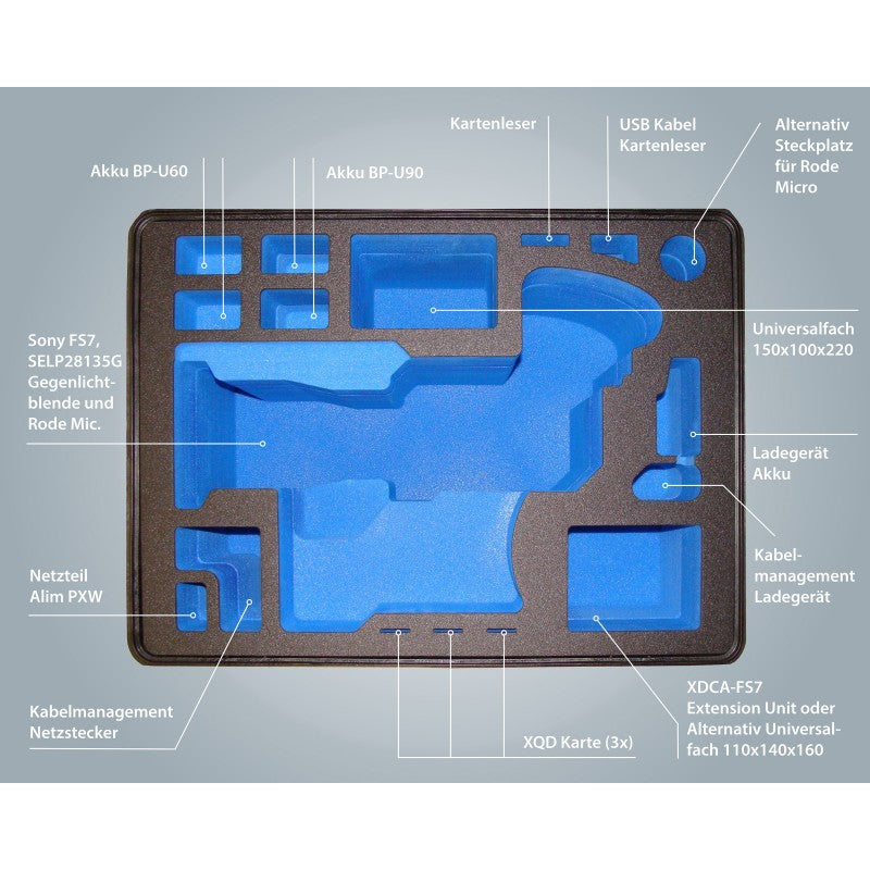 Ein absolut unverwüstlicher Koffer vom Markenhersteller TOMcase für Sony FS7 oder FS5 Camcorder und viel Zubehör. Das hochwertige Inlay verstaut die Kamera sicher, ordentlich und schütz Ihr Equipment maximal vor Transportschäden. Es wurde so konstruiert, dass der Sony Camcorder mit montierter Gegenlichtblende und Rode Mikrofon im Koffer verstaut wird. Dies spart nicht nur Platz, sondern auch Zeit und macht den Case noch benutzerfreundlicher. Unser Outdoor Trolley Case ist für den härtesten Außeneinsatz von uns entwickelt worden und hält jedem Härtetest stand. Der Koffer erfüllt die strenge IP67-Norm und ist 100% wasserdicht, staubdicht und bruchsicher. Wir bieten Top Qualität bei Koffer und Schaumstoffinlay - ausgelegt für den Dauereinsatz (kein Asien-Import).