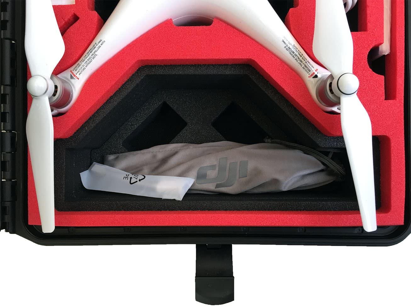 Der DJI Phantom 4 Pro Plus passt mit montierten Propellern in den Koffer. Wir empfehlen die Gimbalklemme ebenfalls abzunehmen damit der Phantom 4 Pro Plus schneller einsatzbereit ist. Der Gimbal incl. Kamera wird durch einen am Boden befindenden Spezialschaumstoff gehalten.