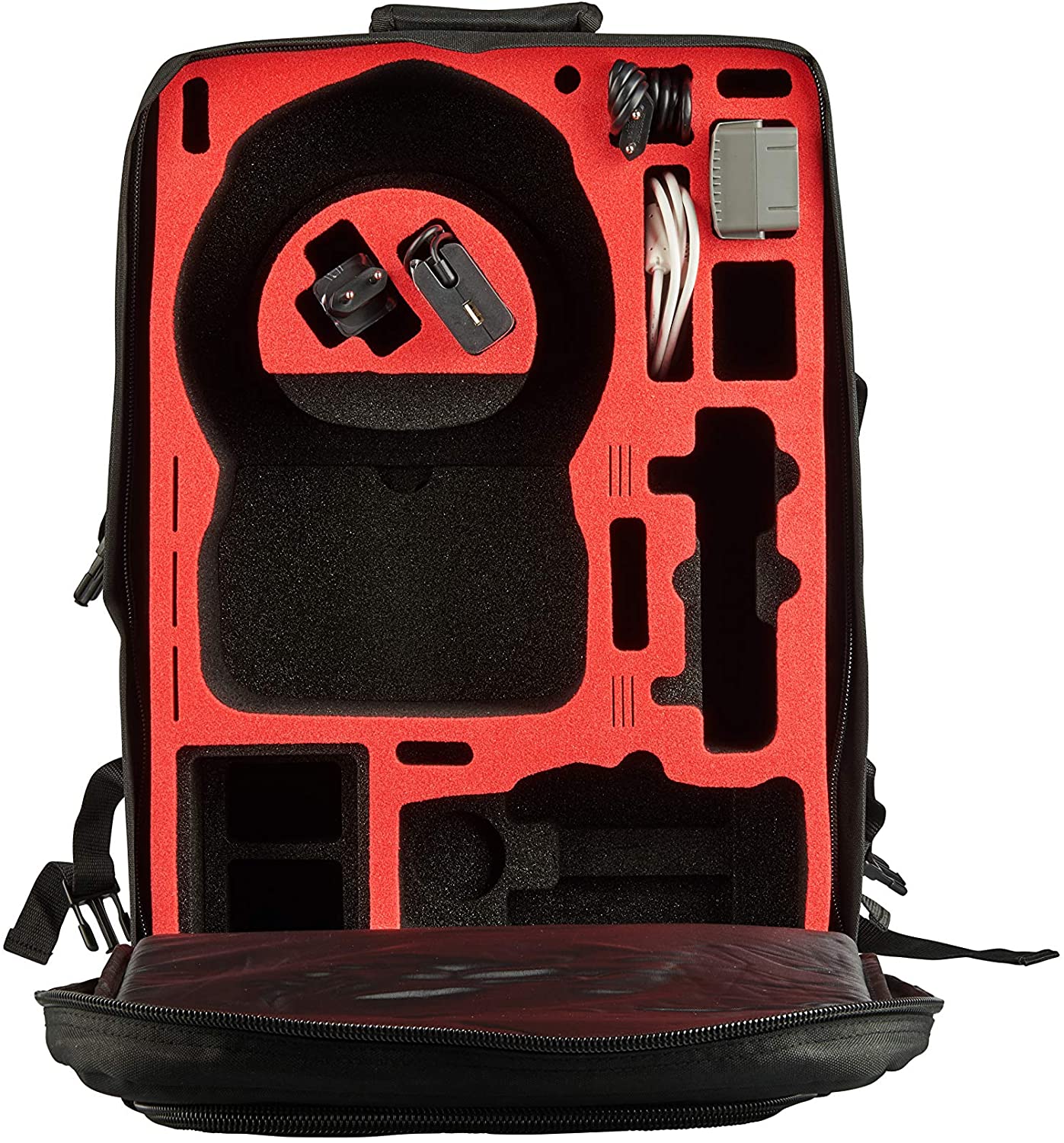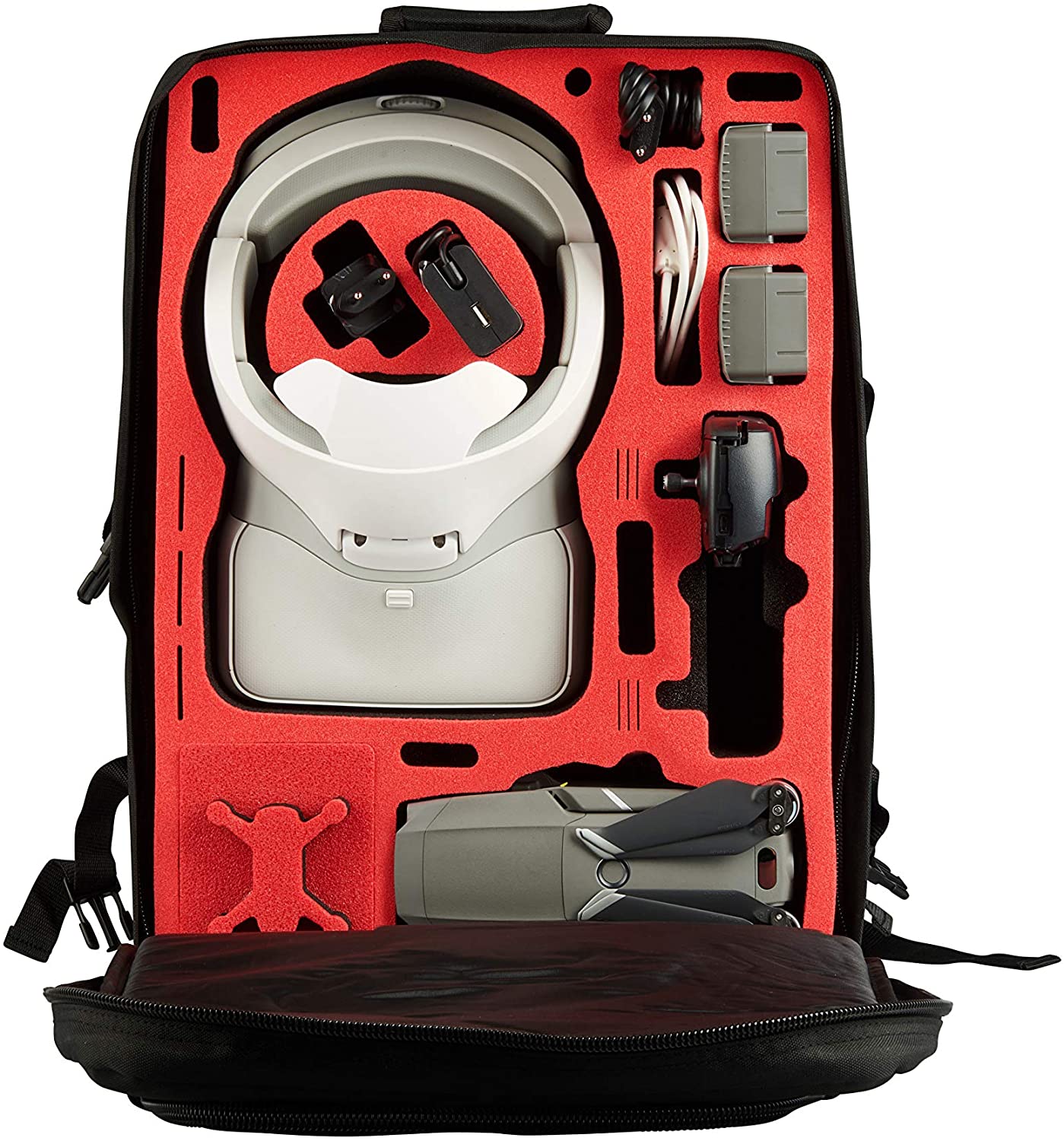 - Im Einzelnen kannst du folgende Dinge verstauen: DJI Mavic Pro inkl. Akku, Props und Gimbal Cover, 4x DJI Mavic 2 Intelligent Akku (3x im Schaumstoff und 1x in der DJI Mavic 2), 1x DJI Mavic 2 Fernbedienung, 1x DJI Multicharger, 4x Ersatzpropeller, diverse Kabel wie DJI Mavic Kabel, Lightning Connector, DJI Goggles / Racing Edition plus Kabel (HDMI, Mini USB), 1x Big Multiuse.