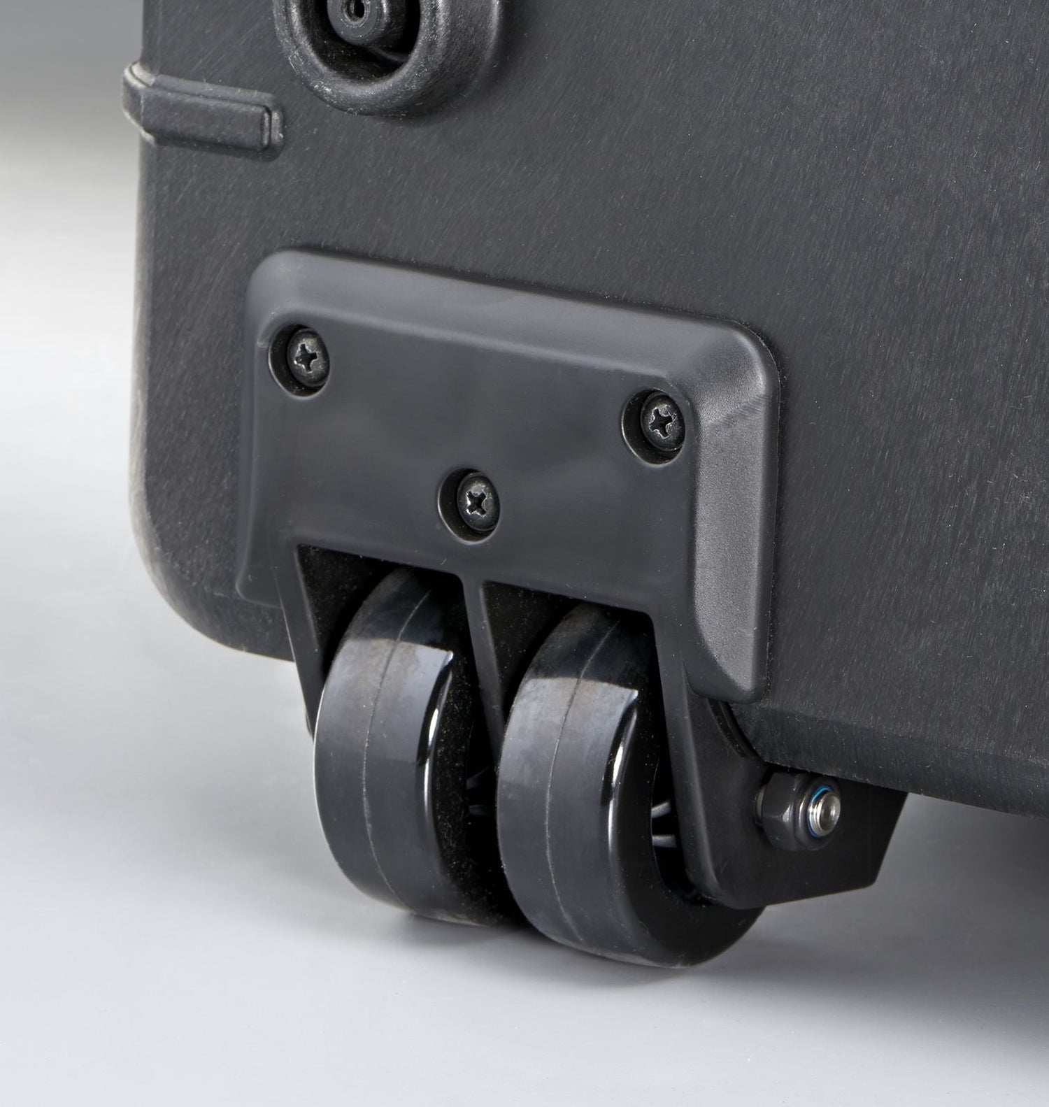 wasser- und staubdichter Koffer in schwarz, leer, mit zwei stabillen Doppel- Leichtlaufrollen und ausklappbarem Trolleygriff.