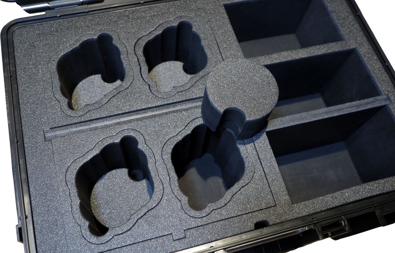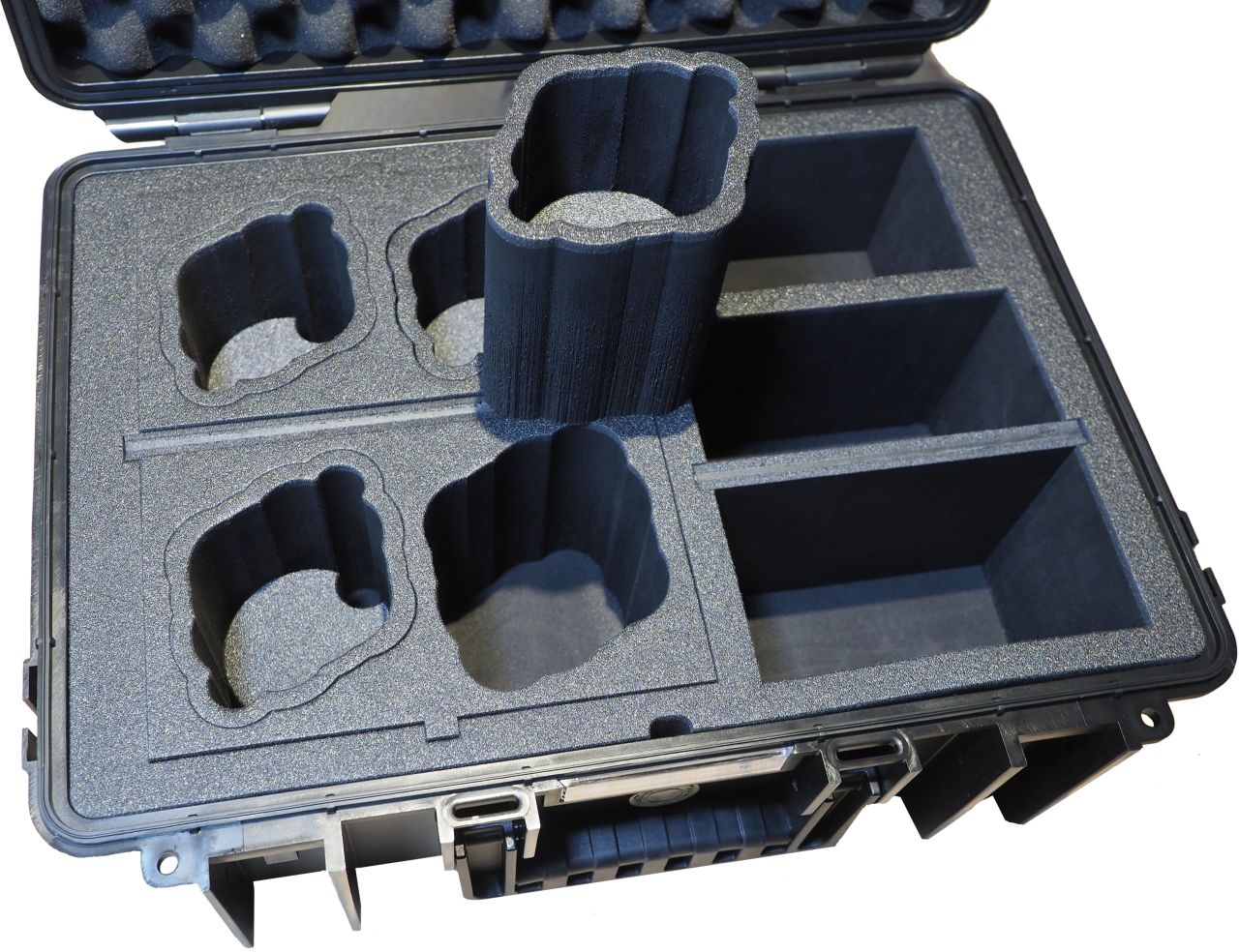 Dank seiner Größe und dem exklusiv für Foto Erhardt entwickelten Inlay aus XPE33/NA36 mH mit vorgefertigten Platzhaltern bietet der Koffer ausreichend Platz für eine System- oder SLR-Kamera mit bis zu fünf Objektiven, einem Blitzgerät und dem nötigen Zubehör. Das Inlay ist so flexibel gestaltet, dass es auch möglich ist Objektive mit unterschiedlichen Durchmessen und Tiefen (inkl. Gegenlichtblende) unterzubringen. Abgesehen davon ist es auch möglich Teleobjektive gut zu verstauen.