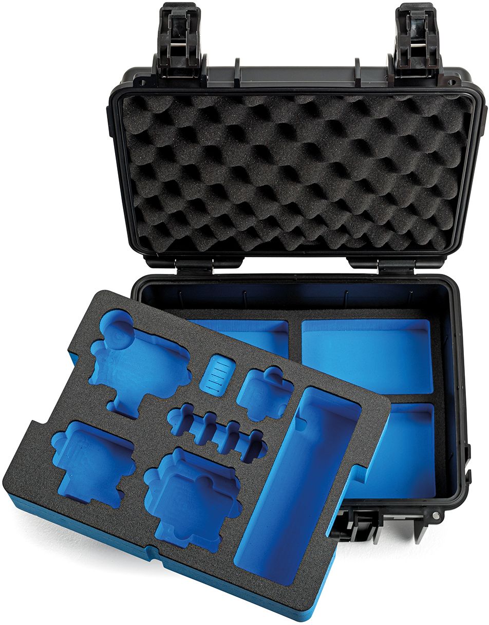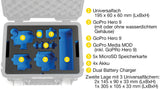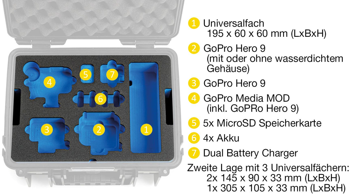 Dank seiner Größe und der zwei vorgefertigten Schaumstofflagen bietet der Koffer ausreichend Platz für zwei GoPro Hero und dem Zubehör wie Gehäuse, bis zu 8 Akkus, Dual Charger, Halterungen, Kabel und vieles mehr.