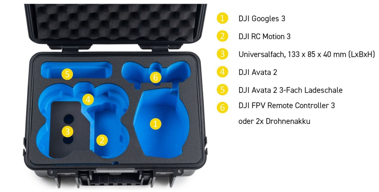 ALLES MUSS MIT: Eine Drohne ist nicht günstig und daher sollte diese zusammen mit dem Zubehör für den Transport bestmöglich geschützt werden. Das outdoor.case 4000 mit Inlay für die DJI Avata 2 oder die umfangreiche DJI Avata 2 Fly More Combo, bietet Platz für deine Drohne, DJI FPV Motion Controller 3, DJI RC Motion 3, DJI Goggles 3 und zusätzliches Equipment, wie z.B. Ersatzpropeller. Dank des vorgefertigten Inlays besteht die Möglichkeit, bis zu 6 Drohnen Akkus (davon einer im Copter) sicher im Koffer zu transportieren.