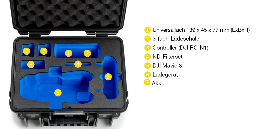 Multimedia-Koffer mit ausreichend Platz für eine DJI Mavic 3. Der gezeigte Kofferinhalt ist nicht im Lieferumfang enthalten.
